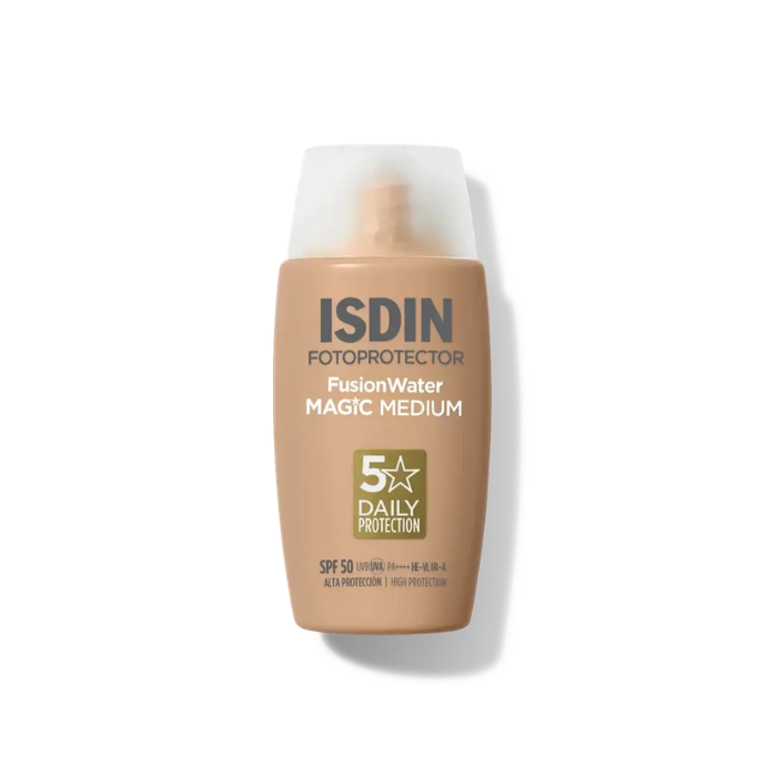 Fotoprotector facial de fase acuosa con color, textura fresca y absorción inmediata para uso diario.