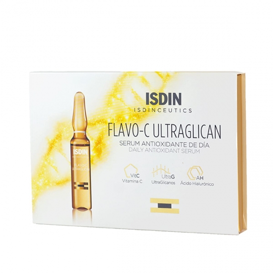 Isdinceutics Flavo-C Ultraglican es una avanzada solución facial en ampollas con Vitamina C y Ultraglicanos. Su combinación de antioxidantes e hidratantes actúa en la pérdida de firmeza y sobre las líneas de expresión. Ayuda a recuperar la luminosidad en la piel, facilita la recuperación de la elasticidad y previene los primeros signos de envejecimiento. Su contenido en Ultraglicanos (proteoglicanos + preproteoglicanos) acelera la producción de ácido hialurónico y proporciona una mayor hidratación.